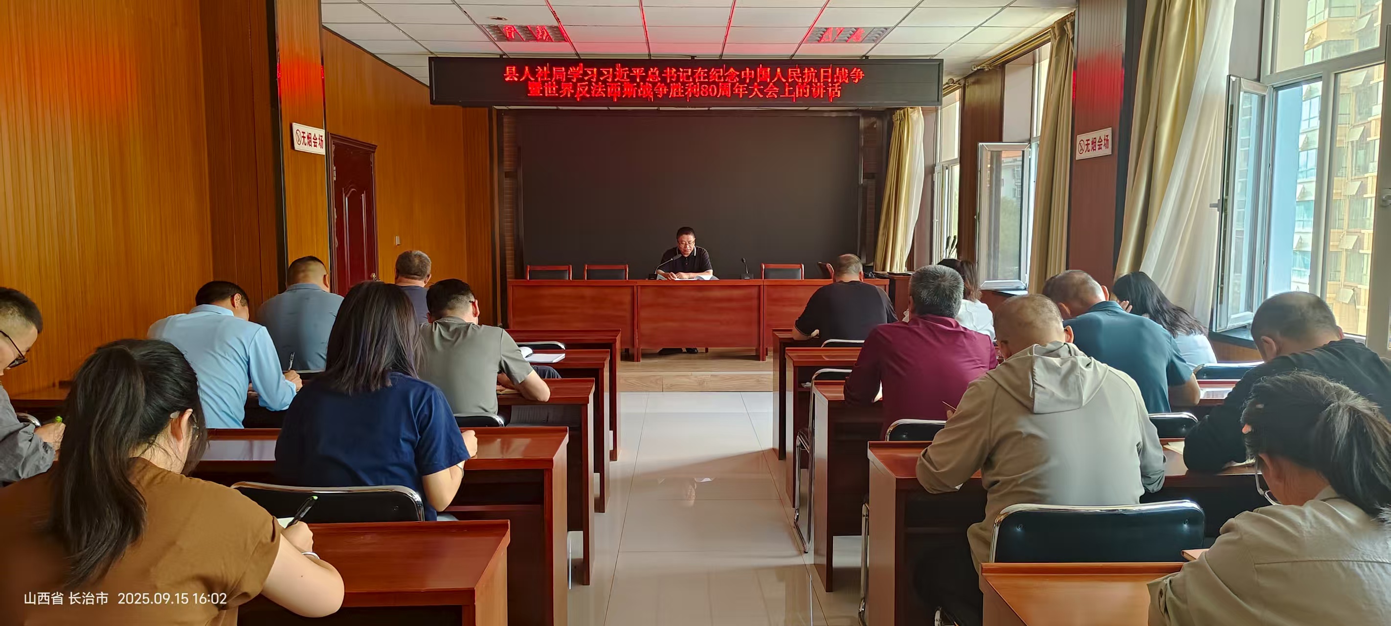 9月15日,平顺县人社局在四楼会议室集中学习习近平总书记在纪念中国人民抗日战争暨世界反法西斯战争胜利80周年大会上的讲话,局党组书记、局长贾擘领学,全体干部职工参会。