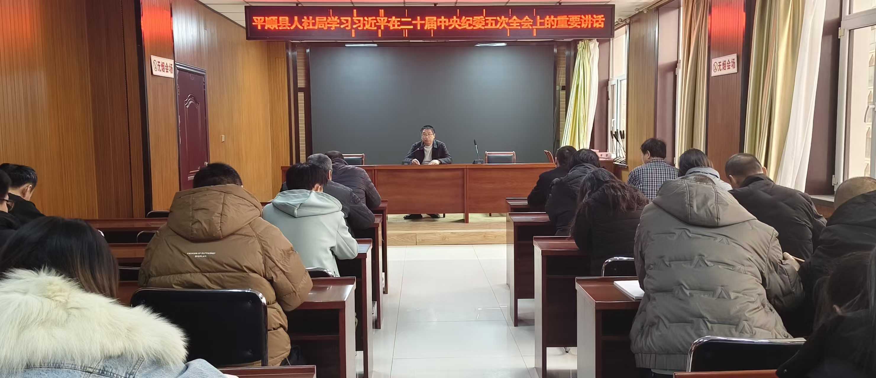 1月20日下午,平顺县人社局在四楼会议室集中学习二十届中央纪委五次全会精神,本次学习由党组书记、局长贾擘主持并领学,全体干部职工参会。