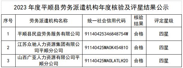 根据中华人民共和国人力资源和社会保障部《劳务派遣行政许可实施办法》(第19号令)、长治市人民政府《关于印发长治市行政审批事中事后监管办法(试行)等9项制度的通知》(长政发〔2019〕50号)和《关于转发人社部《关于进一步规范劳务派遣工作的意见》的通知(晋人社厅发〔2024〕8号)的规定要求,我局对监管的劳务派遣单位进行了书面及实地核验,现将核验及星级评定结果公示如下。公示期为2024年5月9日至2024年5月15日。公示期间如有异议,请拨打电话:0355-8899669。