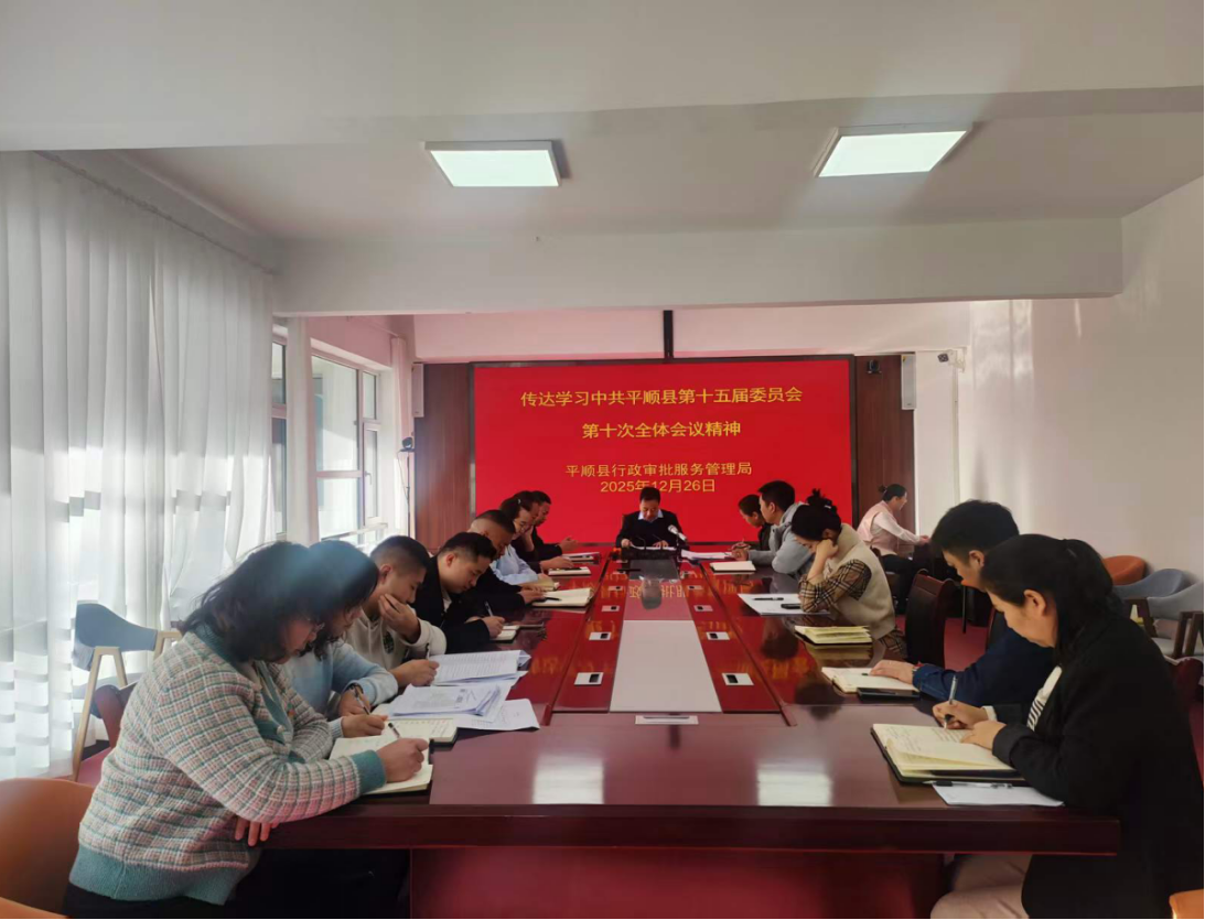 为切实把思想和行动统一到县委决策部署上来,近日,县行政审批服务管理局召开专题会议,传达学习中共平顺县第十五届委员会第十次全体会议精神,局领导班子成员、股室负责人参加会议。
