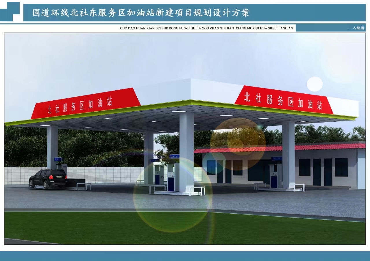 长治市财联路桥开发有限公司承建的国道环线北社东服务区加油站新建项目,位于国道环线北社东服务区北侧。本项目用地面积5568㎡,容积率0.08,建筑密度7.59%,绿地率20.53%,建筑退让用地红线南3米、北3米、东3米、西3米,停车位5个。建设内容包括站房和罩棚,总建筑面积422.41㎡,计容面积422.41㎡,其中站房建筑层数为1层,建筑面积为149.41m2;罩棚长28.0m,宽20.0m,钢结构投影面积559.14m2,建筑面积按柱外围围合面积计算为273m2。