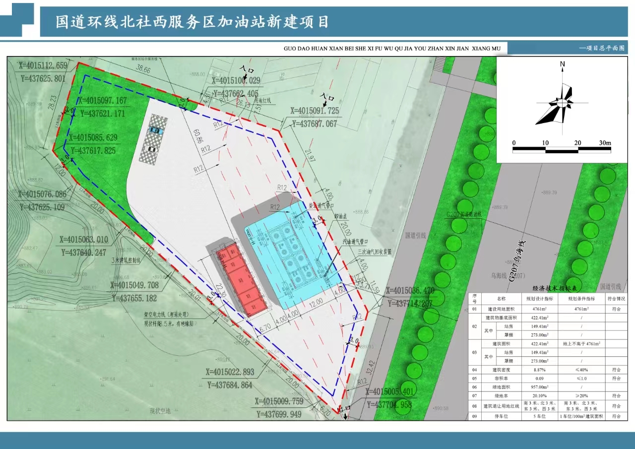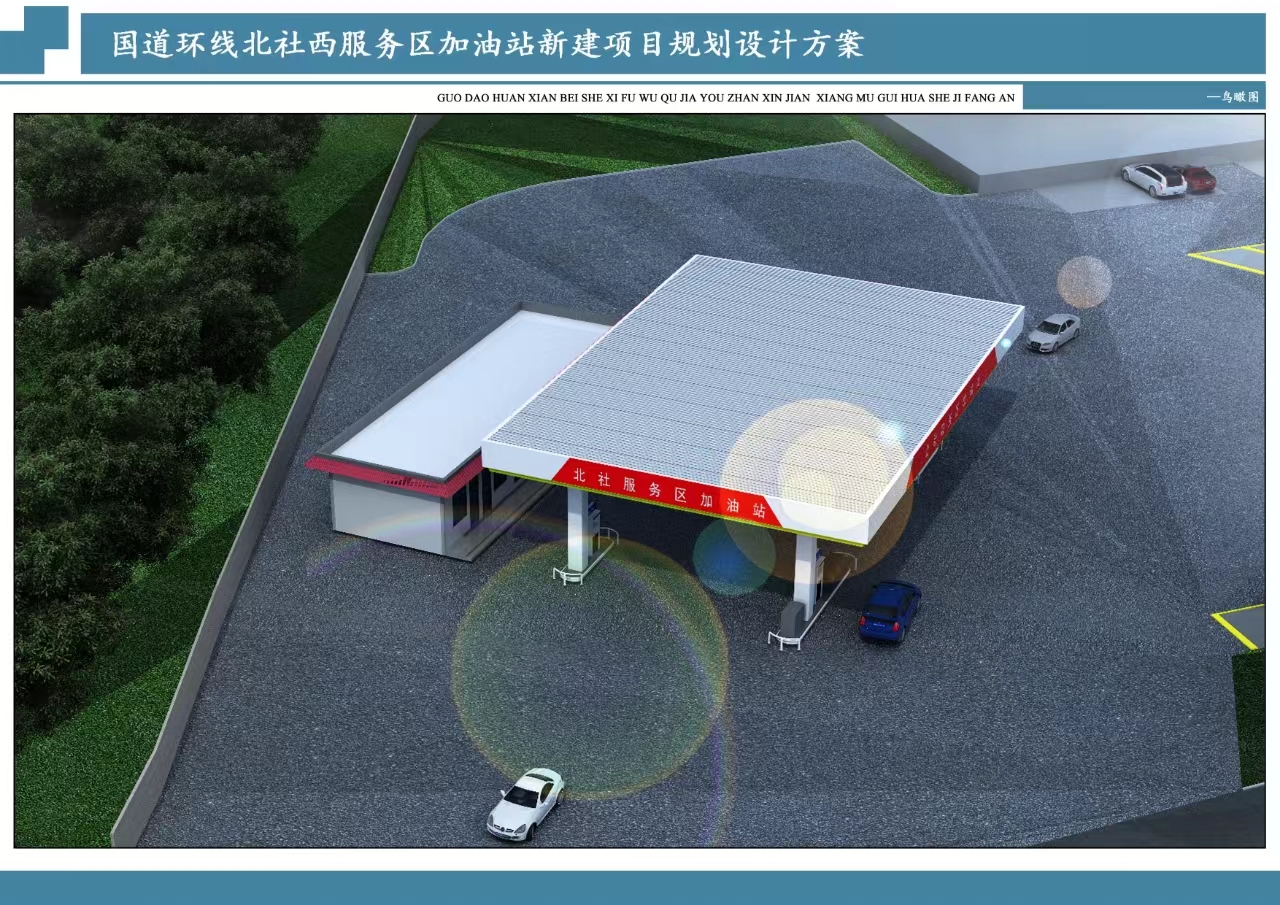 长治市财联路桥开发有限公司承建的国道环线北社西服务区加油站新建项目,位于国道环线北社西服务区南侧。本项目用地面积4761㎡,容积率0.09,建筑密度8.87%,绿地率20.10%,建筑退让用地红线南3米、北3米、东 3米、西 3米,停车位5个。建设内容包括站房和罩棚,总建筑面积422.41㎡,计容面积422.41㎡,其中站房建筑层数为1层,建筑面积为149.41m2;罩棚长28.0m,宽20.0m,钢结构投影面积559.14m2,建筑面积按柱外围围合面积计算为273m2。