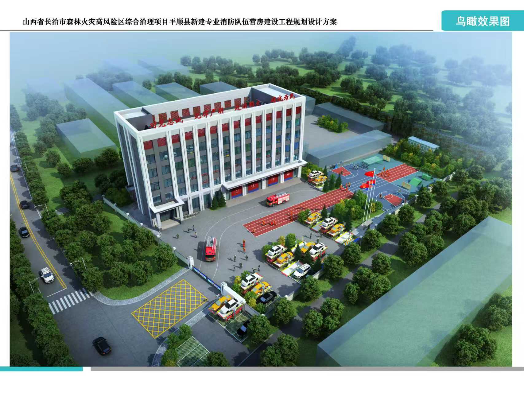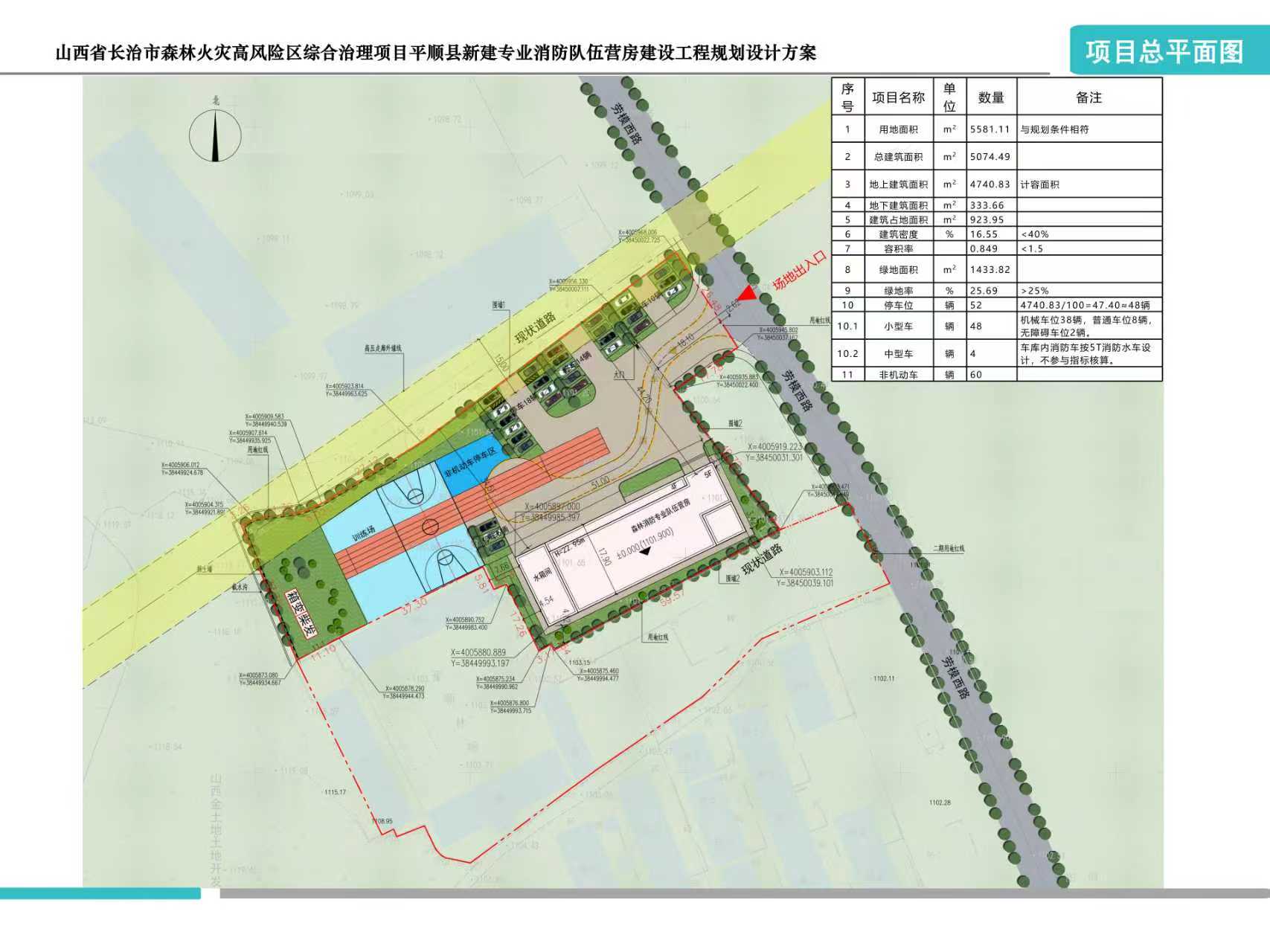 长治市规划和自然资源局建设的山西省长治市森林火灾高风险区综合治理项目平顺县新建专业消防队伍营房建设工程,位于平顺县西沟乡石埠头村北部,劳模西路西侧。本项目用地面积5581.11㎡,容积率0.849,建筑密度16.55%,绿地率25.69%,建筑退让用地红线南3.42米、北34.51米、东3米、西4.54米,停车位52个。建设内容包括营房建筑及附属配套工程,总建筑面积5074.49㎡,计容面积4740.83㎡。建筑层数为地上5层,局部地下1层。地上建筑面积为4740.83m2,地下建筑面积333.66㎡。建筑长51.0m,宽17.9m。该项目符合规划条件要求,我局2026年1月26日为该项目核发建设工程规划许可证,证号:1404252026GG0001635。现予以公布。