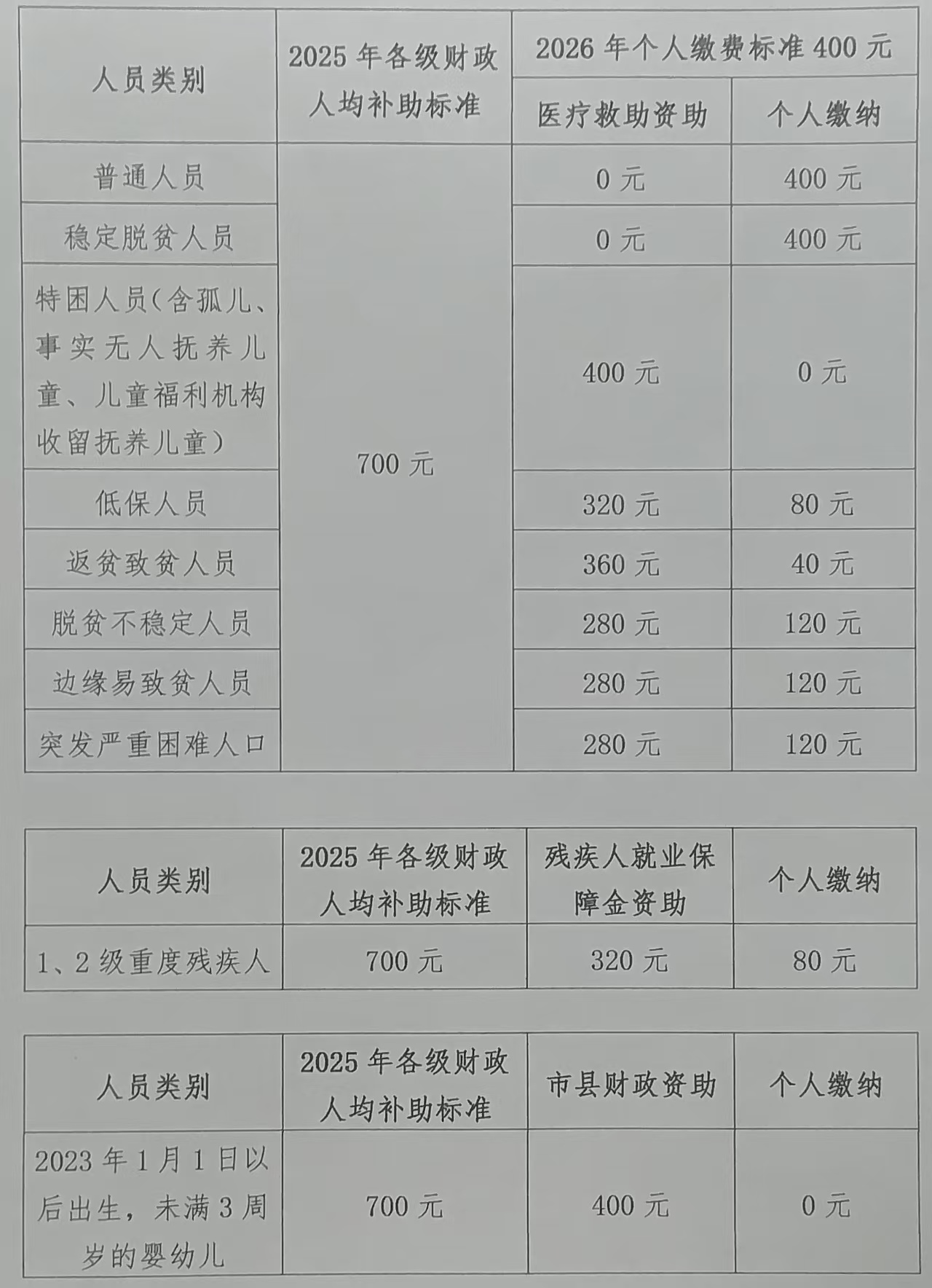 2025年,城乡居民基本医疗保险人均财政补助标准为700元,2025年预收2026年度的个人缴费标准如下: