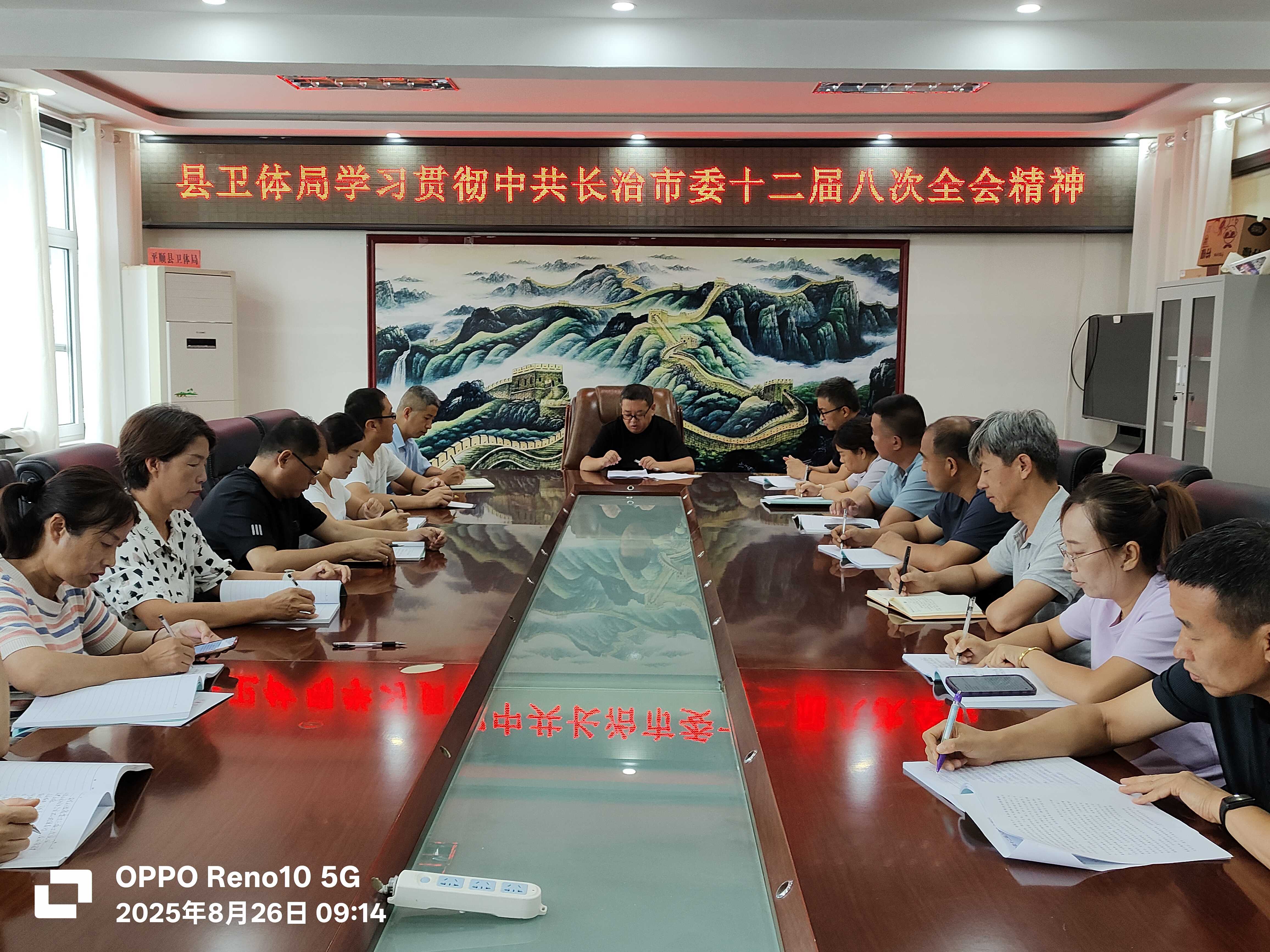 为深入领会习近平总书记考察山西重要讲话重要指示精神,贯彻落实市委决策部署,8月26日,平顺县卫体局组织全体干职工开展市委十二届八次全会精神集中学习。
