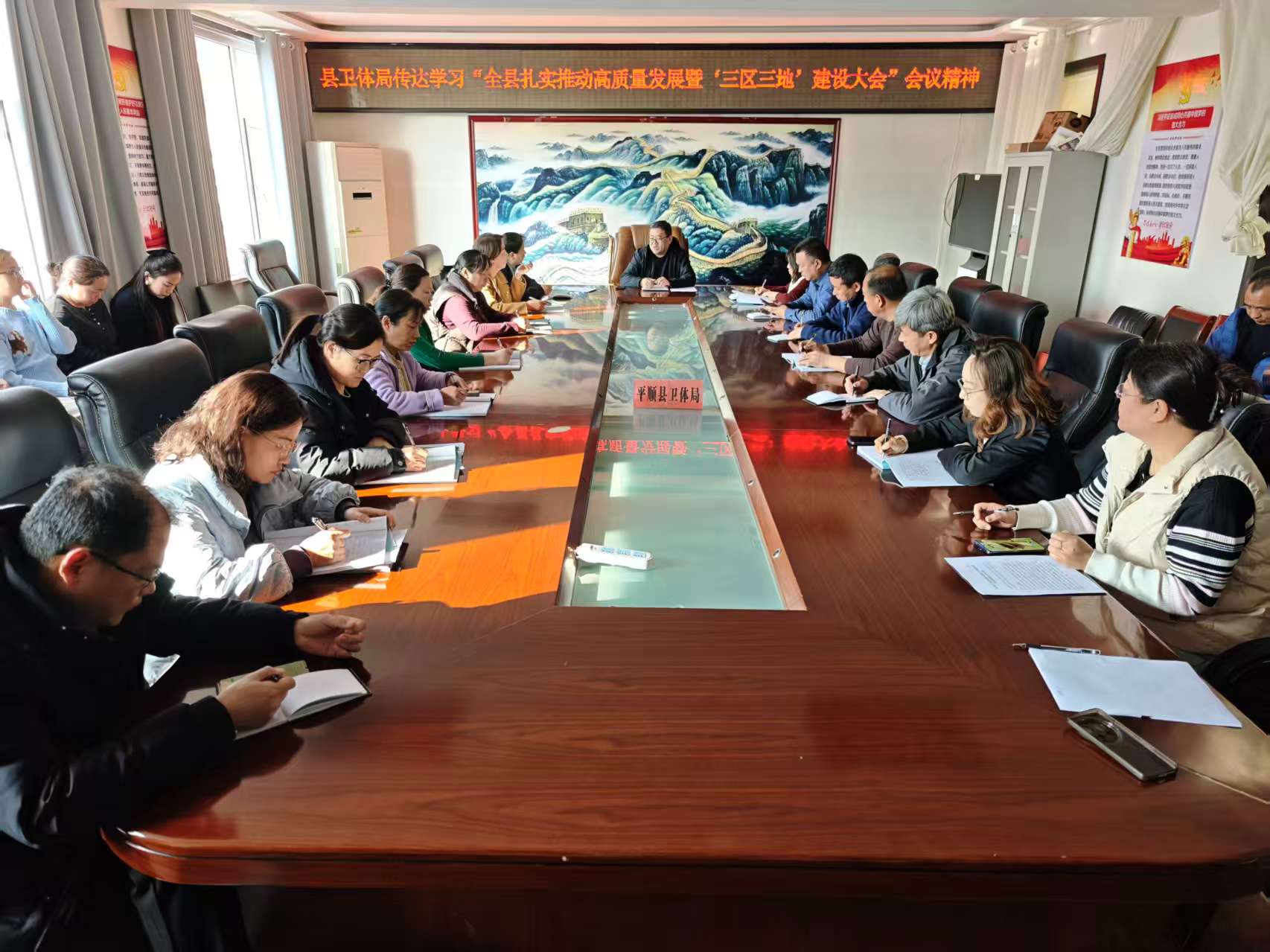 为深入贯彻落实全县扎实推动高质量发展暨“三区三地”建设大会精神,切实把全局干部职工的思想和行动统一到县委、县政府决策部署上来,近日,平顺县卫生健康和体育局召开专题会议,集中传达学习大会核心要义与工作要求,研究部署卫生健康和体育领域贯彻落实举措。