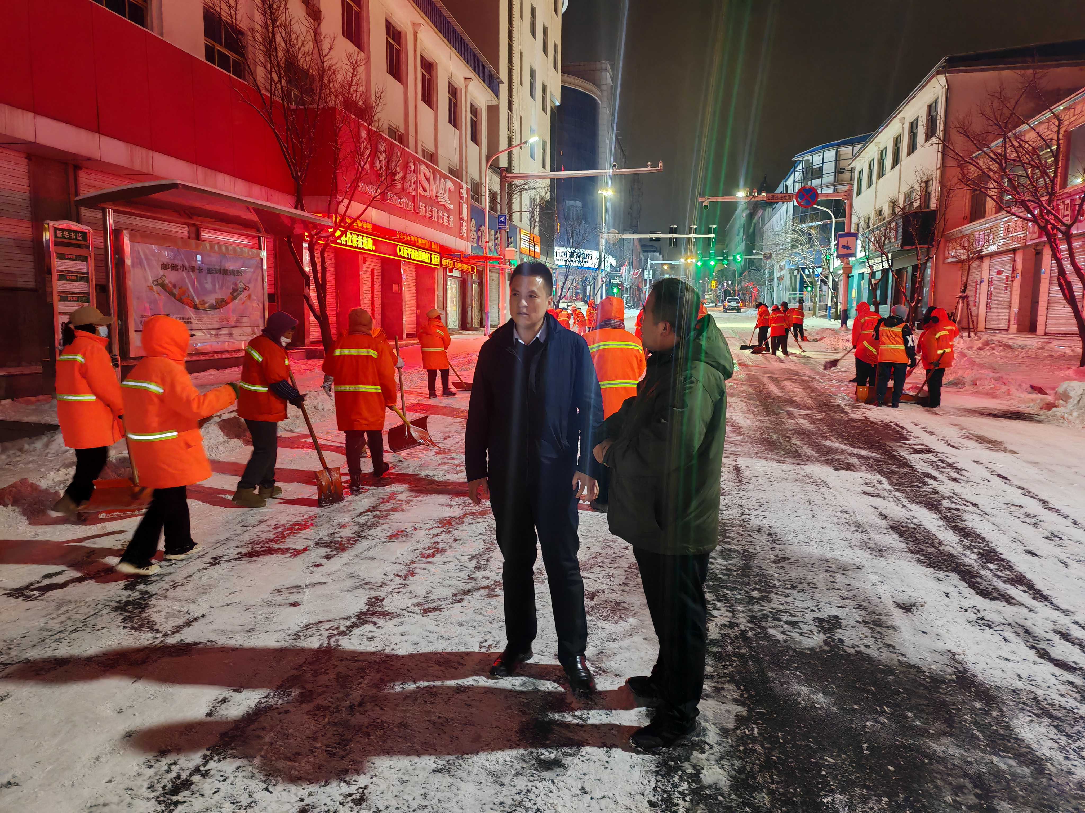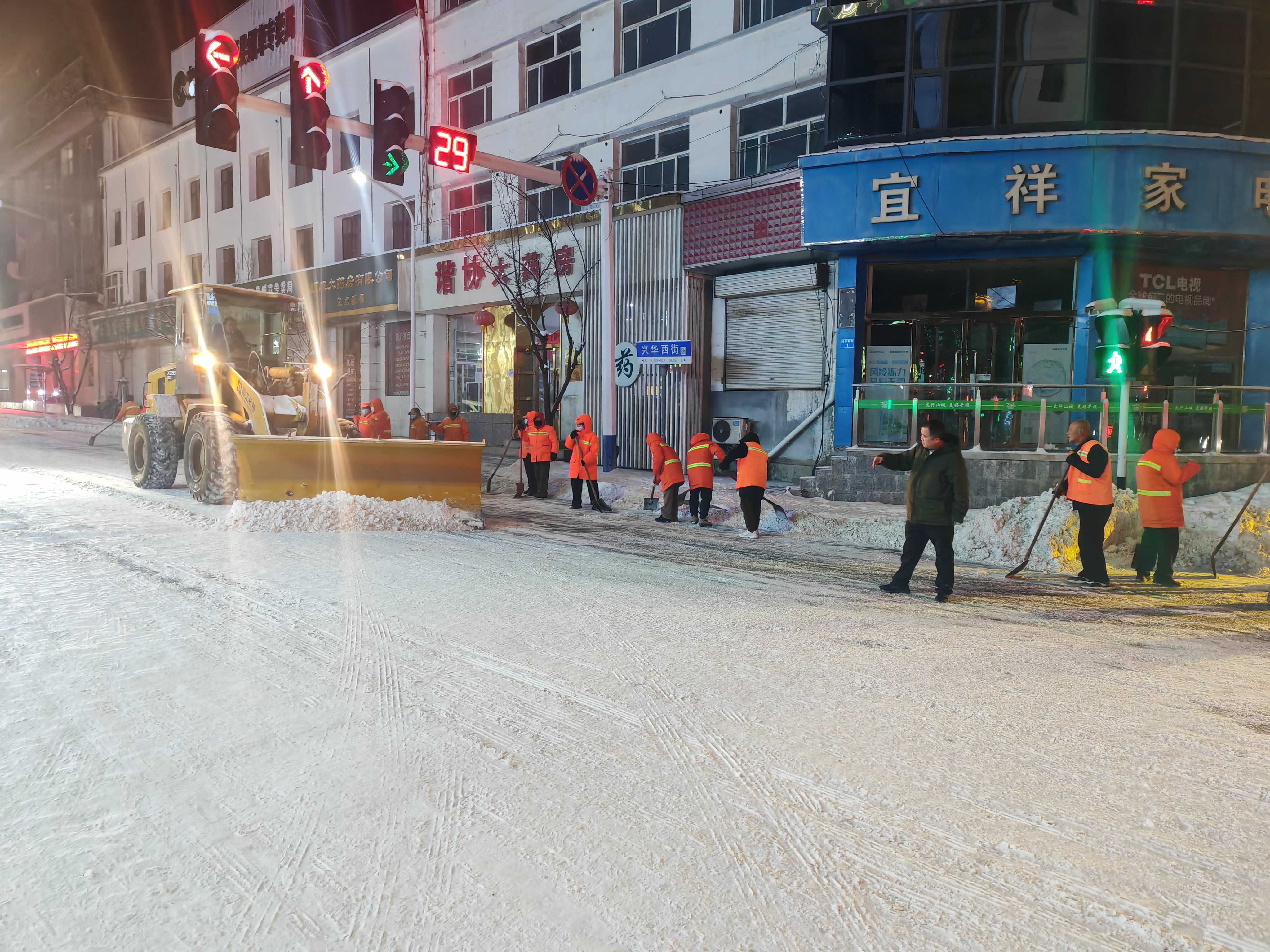 我局坚持“以雪为令、雪停路净、安全畅通”的工作原则,降雪伊始,第一时间组织环卫、园林、城管作业队伍,调配除冰融雪物资设备,按照“先主干、后支路,先桥梁、后路面”的作业顺序,对辖区主干道、桥梁、公交站点、学校及医院周边等重点区域,精准播撒融雪剂,快速降低路面结冰风险。随着雪势渐强,采取“机械主导、人工协同”的科学处置方式,除雪滚、推雪铲、铲车等大中型作业设备开展循环作业,高效清除路面积雪,环卫工人、园林工人、城管队员使用推雪板、雪铲等工具,对机械车辆覆盖不到的路肩、人行道等盲区进行集中清理,不留除冰雪死角。