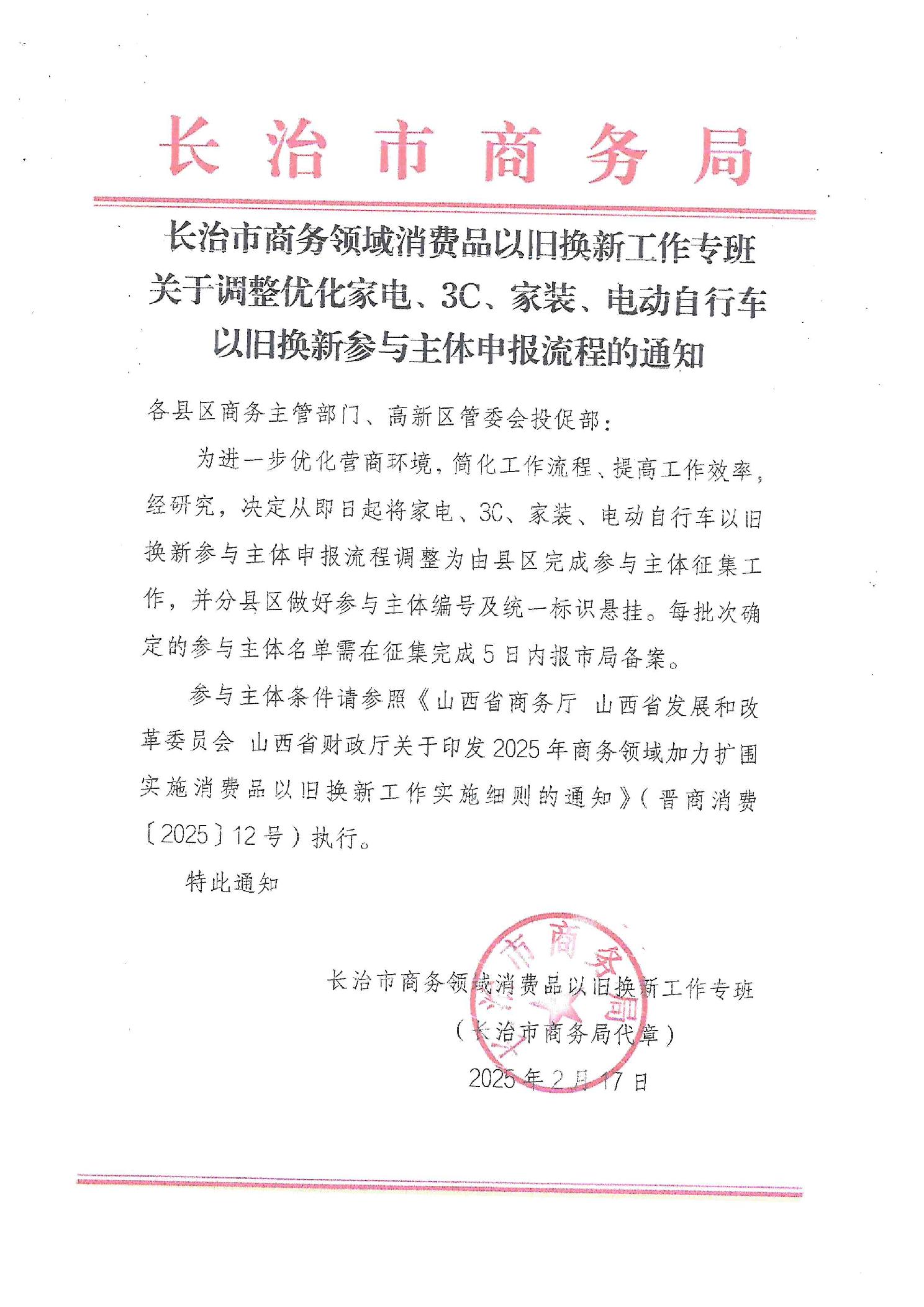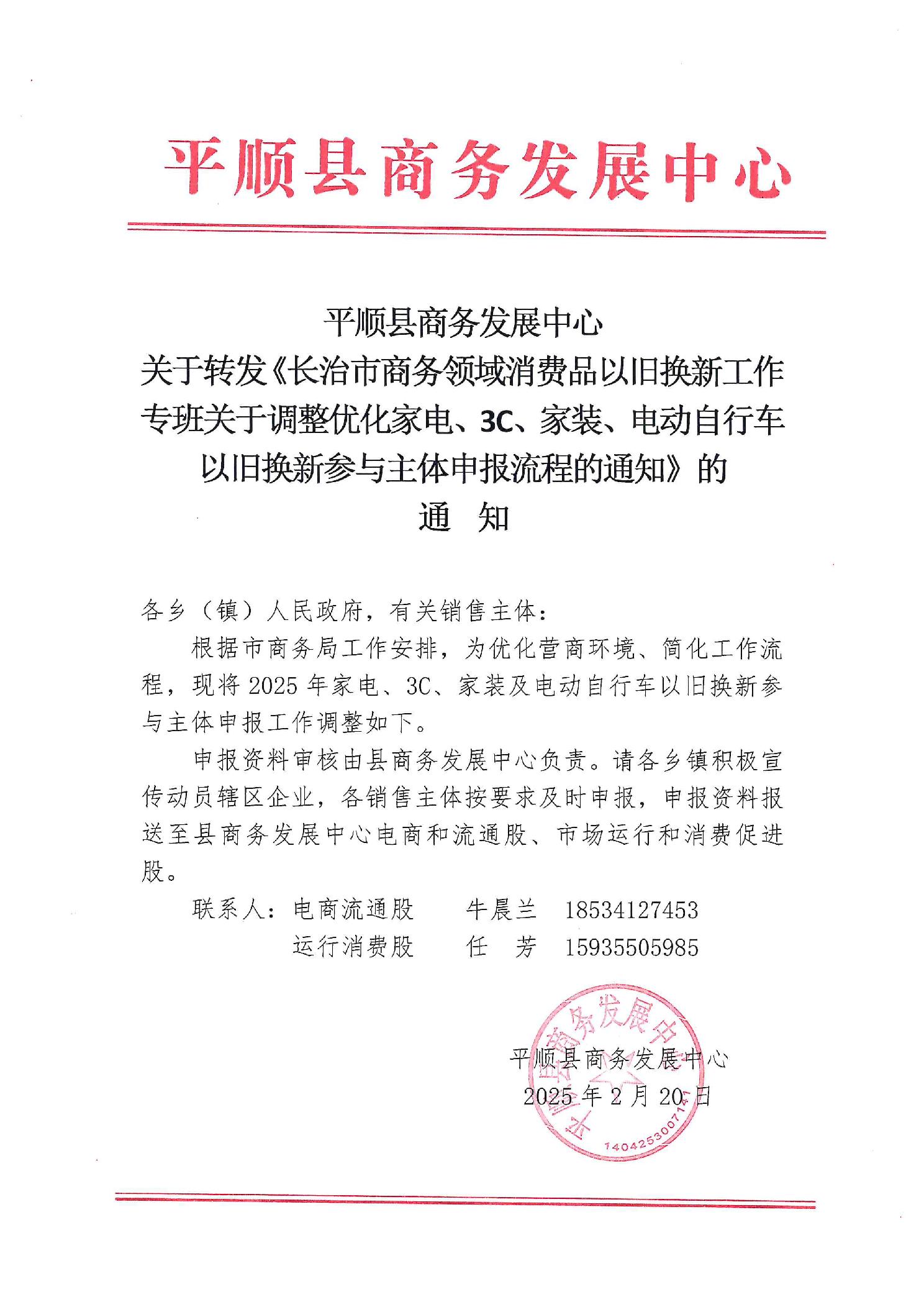 平顺县商务发展中心关于转发《长治市商务领域消费品以旧换新工作专班关于调整优化家电、3C、家装、电动自行车以旧换新参与主体申报流程的通知》的通知