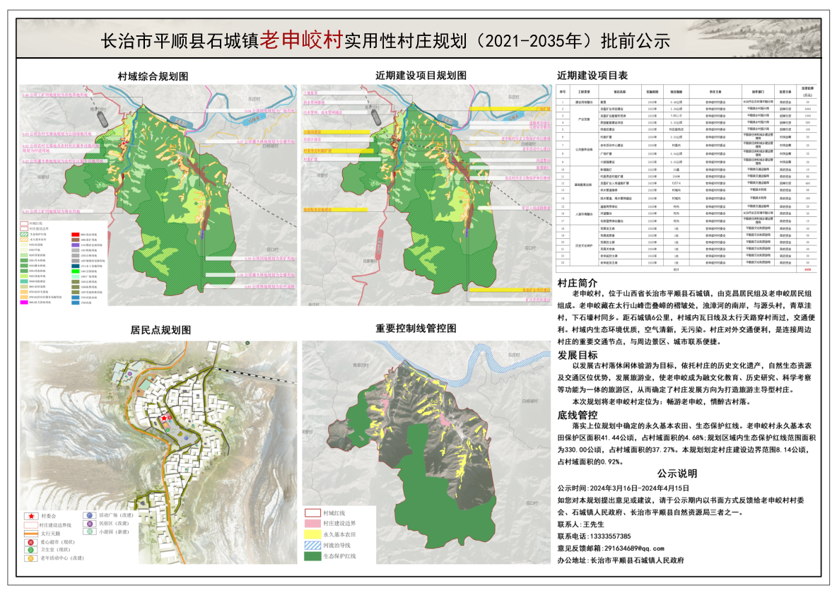 如您对本规划提出意见或建议,请于公示期内以书面方式反馈给老申峧村村委会、石城镇人民政府、长治市平顺县自然资源局三者之一。