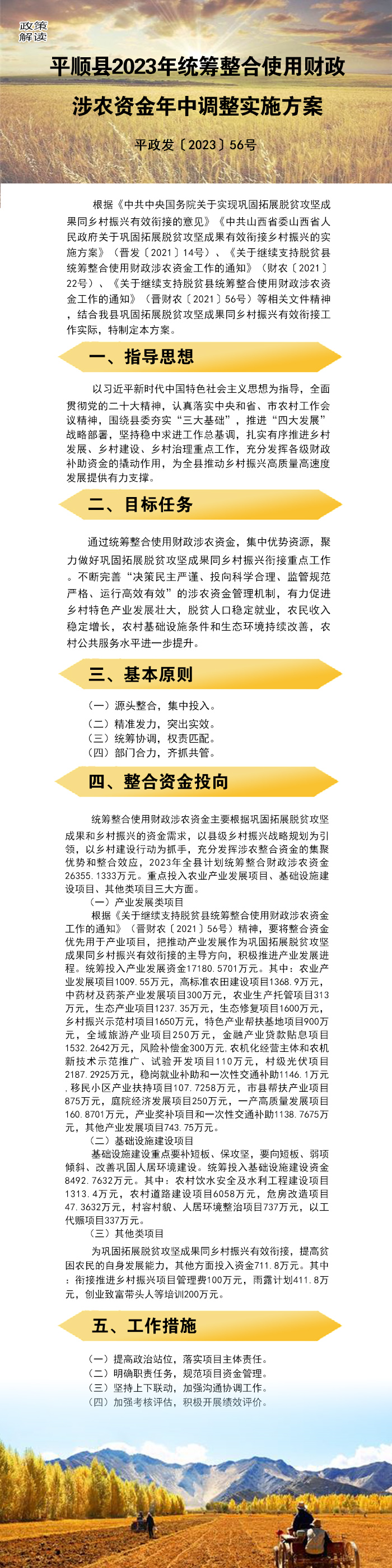 原文链接:关于印发平顺县2023年统筹整合使用财政涉农资金年中调整实施方案的通知